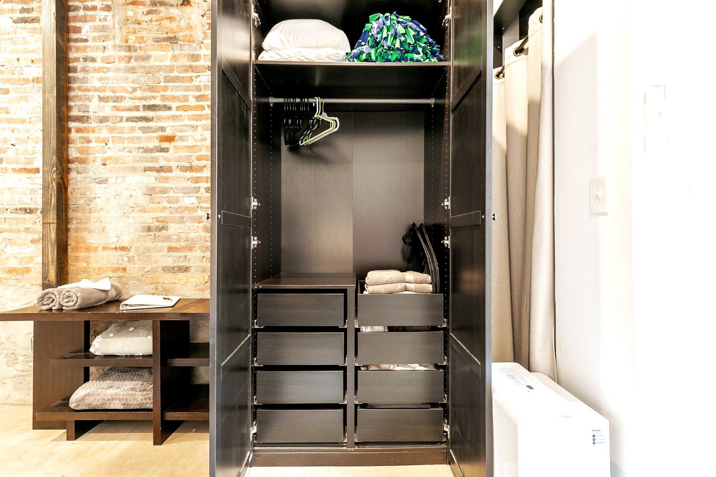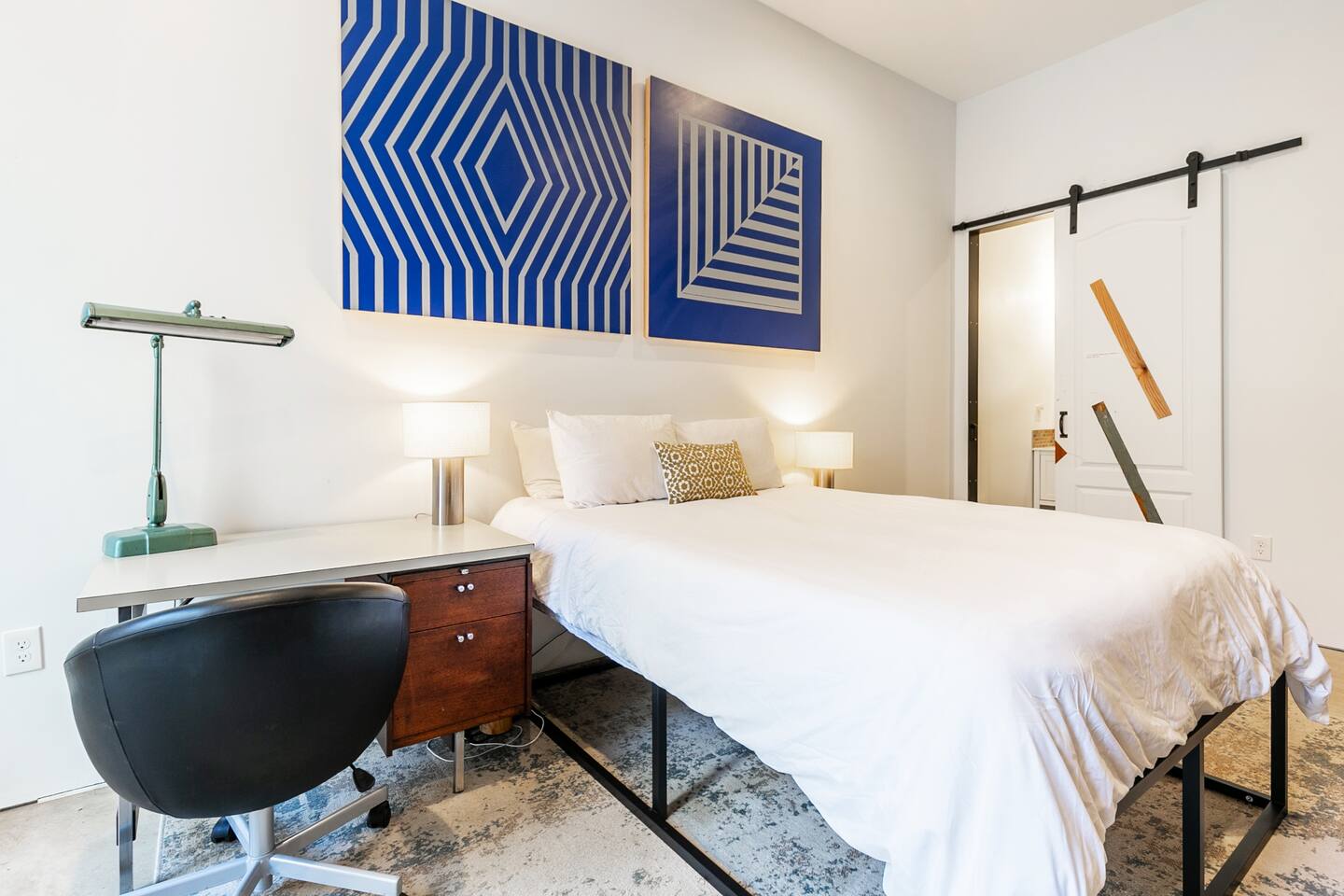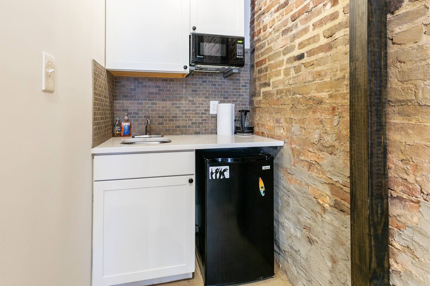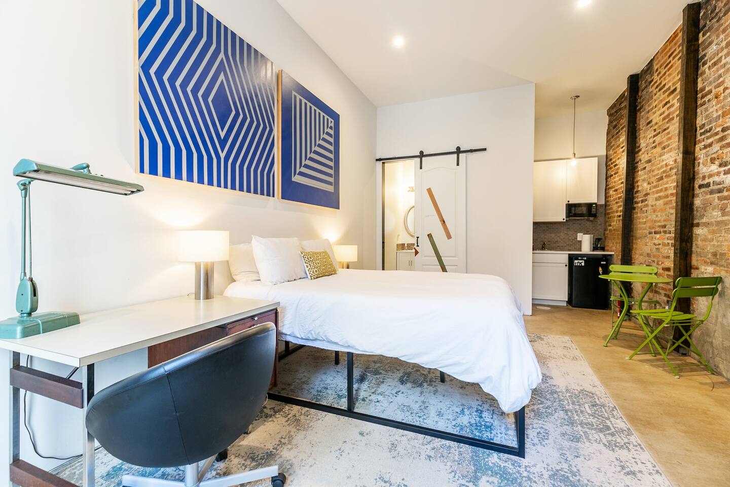 The studio is a very modern design with a deep connection to history. We made decisions to keep the space minimal to highlight the rich materials of the space and afford art (including furniture) to stand out. The space includes a queen size bed with linens, a small desk, a lamp stand, a full wardrobe with a hanging bar and drawers, a small shelf, and a bistro table set for two. The wet bar is moderately appointed with hot pot to boil water, utensils, plates, cups/glasses, and silverware. There is a full private bathroom with linens, a heated floor, and very tall and elegant modern shower stall. In front of the studio is another space where other guests may be staying. The heat and AC units are separate for each space. The courtyard is the only shared space between the front and the studio. This space is an art gallery! The works that are depicted on the walls in the profile photos MAY be different than what is presently in the space. If you are curious what we are showing, ask and we can direct you to the current works.